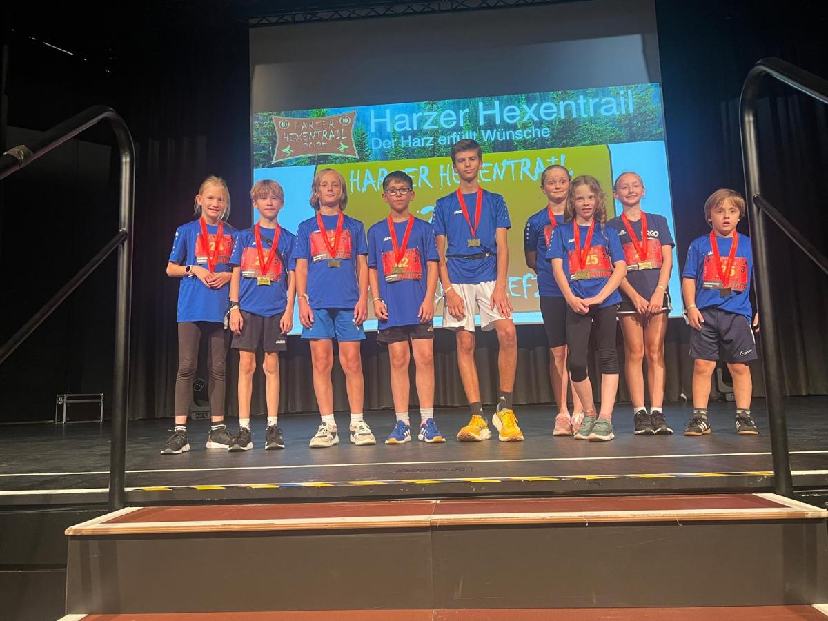 Unter großem Applaus der zahlreichen Zuschauer liefen alle Teams in die Stadthalle ein und bekamen als Erinnerung eine Medaille. Team 3 vom MTV lief als 6. Team ins Ziel. Nachdem alle Kinder und Betreuer eingelaufen waren konnten sich die Kinder nochmal zusammen auf der Bühne feiern lassen. In diesem Jahr kam eine Spende von 1.500 € für das Kinder- und Jugendhospiz „Sternenlichter“ in Göttingen zusammen. Auch in diesem Jahr war der Kinderhexentrail wieder ein tolles organisiertes Event. Danke nochmal an die Betreuer Christian Wiegand, Stefan Scherr und Hannah Olbrich. Wir freuen uns auf den Kinderhexentrail 2026.